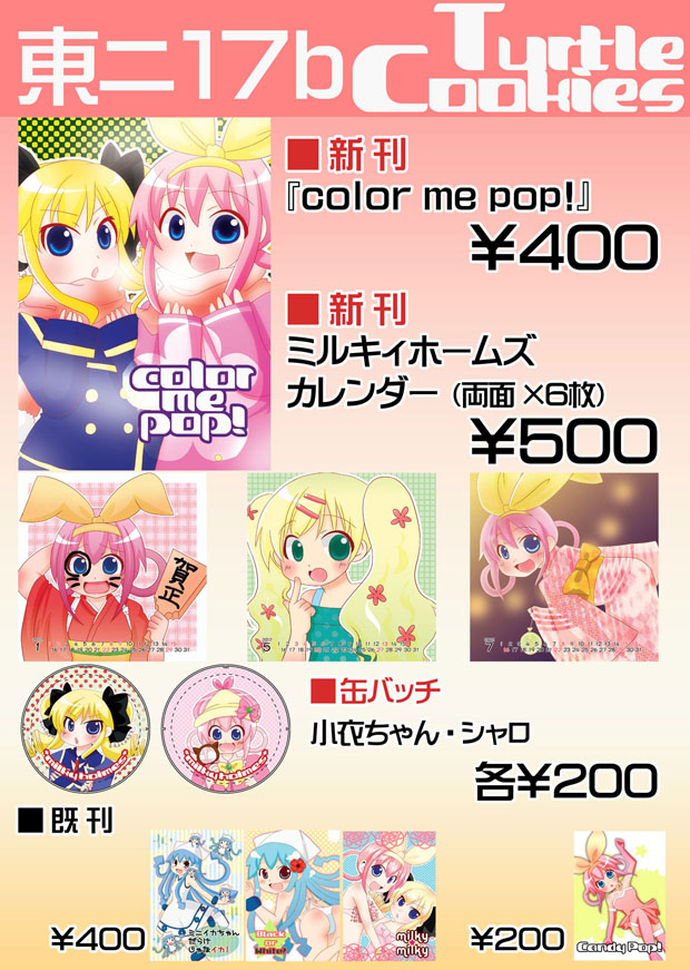 昨年は大変お世話になりました。今年もどうぞ宜しくお願い致します。 また、冬コミにお越しくださった方本当にありがとうございました。 差し入れもありがとうございます! 初めましてな方も含めていろいろな方にお会いできて嬉しかったです♪ 30分くらい席を外していた間に起こしいただいた方もいらっしゃったようで 入れ違いになってしまいスイマセンでした。 もし機会がございましたら次回イベントなどで是非お会いしたいです。 今回はイカ娘spで申し込んだにも関わらず、ミルホばかり新刊&グッズを出していたこともあり お客さんはまばらでしたねwww(当たり前) というか、完全に申し込む場所間違えましたwww 夏にはまさかこんなにもテンションが下がるとは思ってもいなかったんですね(^_^;) イカ娘本を期待してくださっていた方には本当に申し訳なかったです。 監督が変わったからかな・・・? 前回とはなんか雰囲気が違ったというのが正直なところです。 ミルホに関しては、新刊&グッズ全部購入いただく方が多くて嬉しい限りでした。 あとカレンダーが思ってた以上に旅に出ていました。 初めて作ったのでどうなることかとドキドキでしたが、沢山の方に手にとっていただいてビックリでしたね。 何はともあれ色々ありましたが、あっという間に冬コミが終わってしまいました。 次回は2/26開催のスーパーヒロインタイムです。 年越しは2年連続で爆睡こいてたのですが、今回は無事に神田明神で年越しでしたwww 甘酒のんで、夜中の3時半ごろ帰宅。 11時まで爆睡して、実家に帰ってきています。 年賀状はこれから書きます(ぇ こんなgdgdなやつではありますが、本年もサークル共々お付き合いいただければ幸いです。 長くなりましたが、どうぞ宜しくお願い致しますm(__)m 2011.12.26 Mon 01:46:14 冬コミお品書き書き忘れていますが・・・ 『当日新刊お買い上げいただいた方に先着でオマケがつきます!!』 ※お買い上げ1度ごとに/1回でいくつ購入いただいても1個です。 ※オマケの数が凄く少ないのでこういった形を取らせていただきます。スイマセン・・・ 諸々立て込んでいて、ようやくお品書きが出来上がりましたので こちらにもUPしておきます。 イカ娘spなのですが、今回一切イカ娘の新刊はありません!!! ミルホばっかりになりましたwww ってかミルホでも申込めばよかったゲソ・・・orz ポスターも作って、大体のスペースデザインも決まったので あとはカレンダー梱包して詰め込むだけです!! もう少しだね(・∀・)☆ ってことで、当日会場でお会いできるの楽しみにしてます♪ 2011.12.01 Thu 21:15:34 カレンダーできました!!2011.11.22 Tue 16:17:18 冬コミでカレンダー販売します2011.10.29 Sat 18:36:17 冬コミ受かりました!!今回も無事受かりました!!\(^o^)/